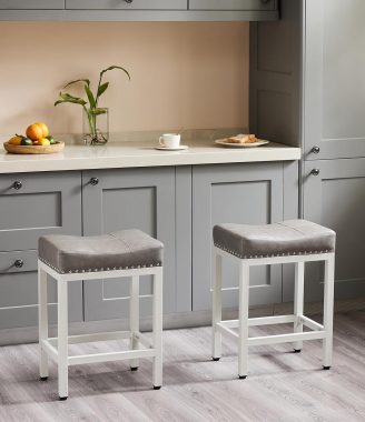 DUMOS Bar Stools Set of 4, 24 inch Counter Height Saddle Stools, Upholstered Modern Kitchen Barstools with Metal Base, PU Leather for Kitchen Island, Grey