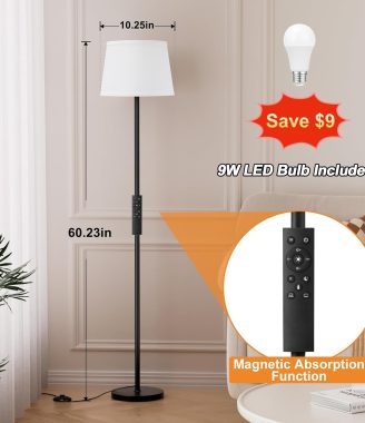 Modern Floor Lamp with Adjustable Brightness, Remote Control, Black, LED Bulbs, White Shade, Foot Switch, Easy Assembly